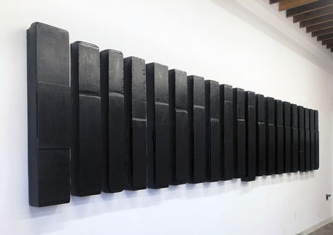Artwork exhibited with James Cohan gallery at The Campus in Upstate New York, U.S. June 19 - October 27, 2024. Rubber, wood, screws. 124.5 x 599.4 x 16.5 cm. Photo by Chris Gardner and NXTHVN.